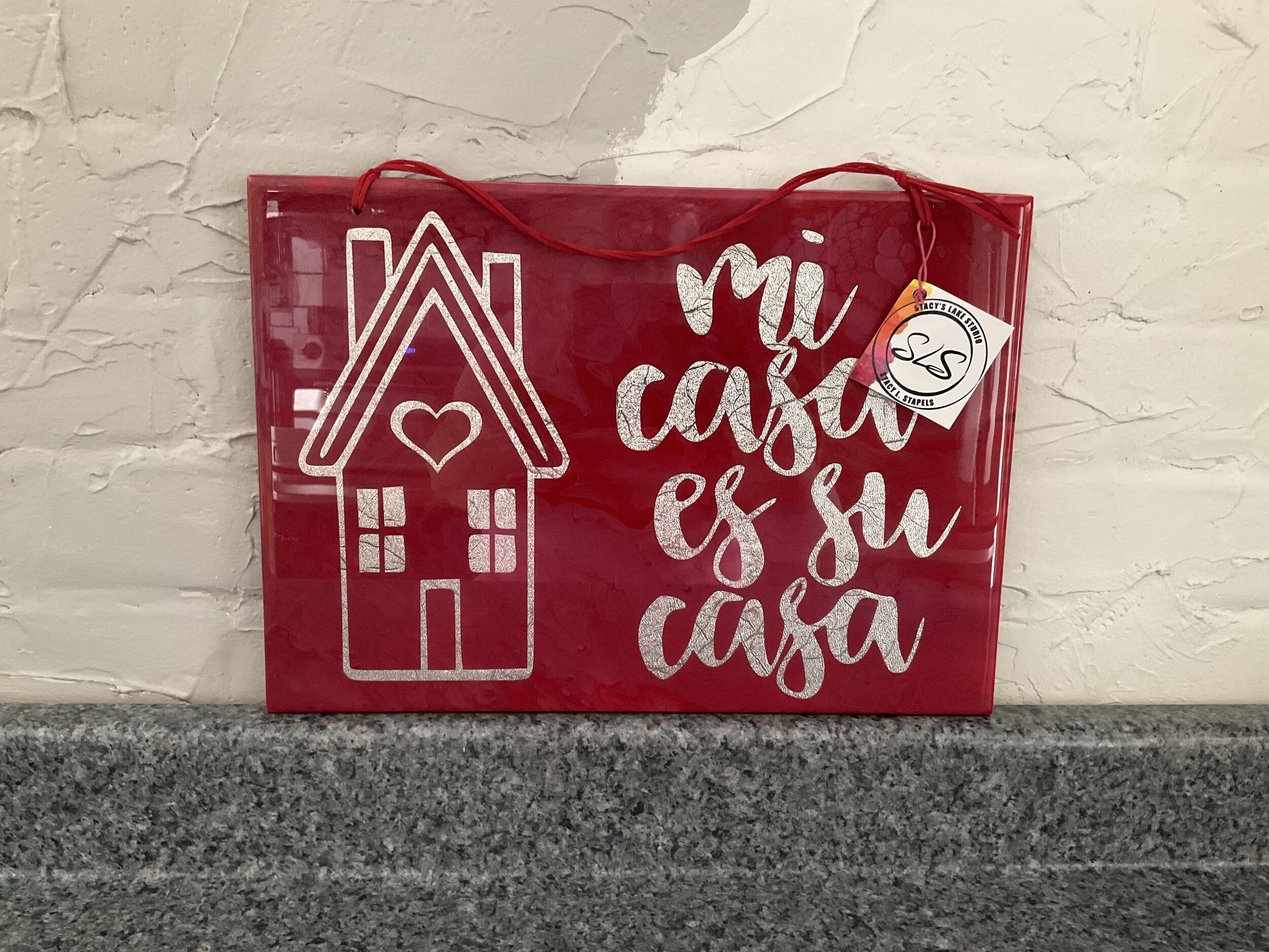 Unique fluid-art ceramic tile signs. 14" x 10". Each tile is individually hand-poured, no two will ever be identical. Most have a decal(s) added. Each piece is then finished with a protective layer of resin. Coordinating suede cord for hanging. Small corner bumpers on back to protect wall. Each tile is stamped on back with logo. For decoration purposes only.